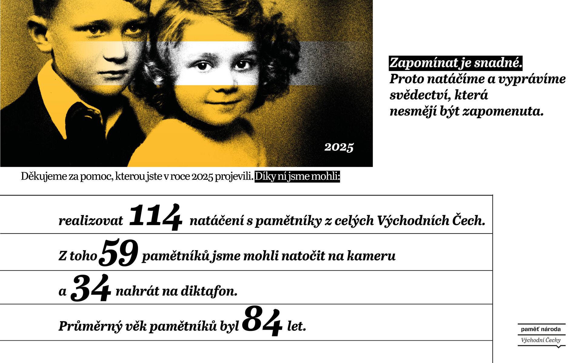 Ve východních Čechách jsme jen za poslední rok natočili více než 80 pamětníků. Průměrný věk člověka, jehož příběh zaznamenáváme, je 83 let. Každý z nich nese zkušenost, která se už nebude opakovat.